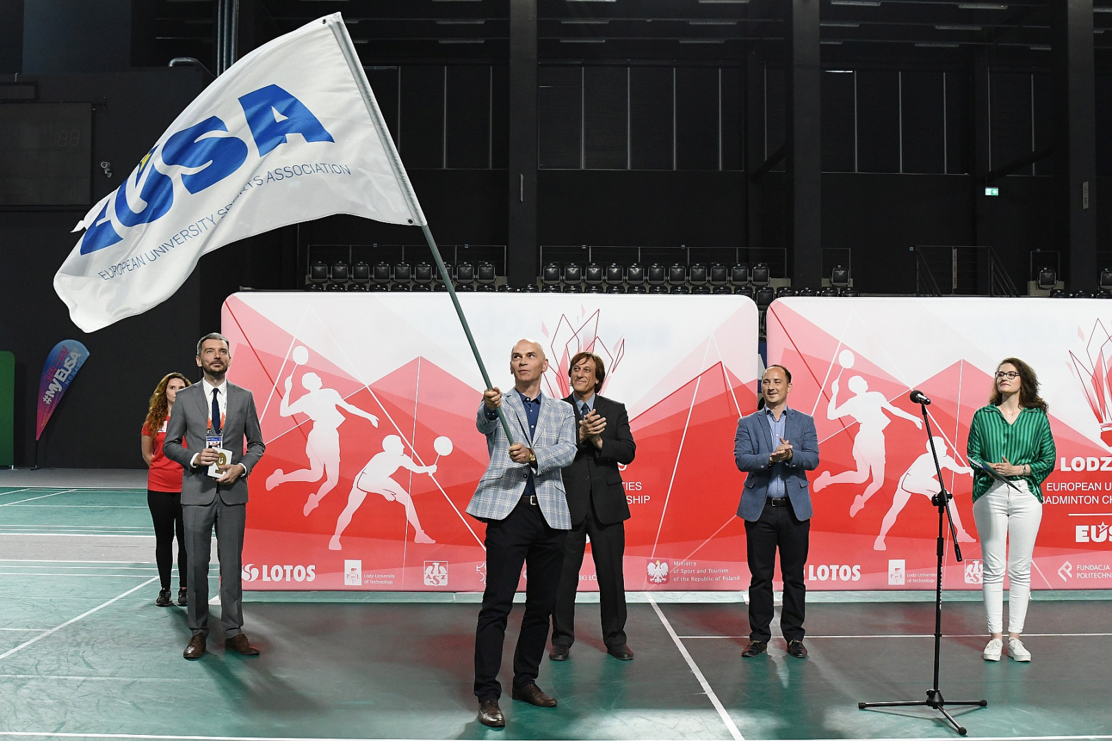 Podczas ceremonii zamknięcia kończącej Akademickie Mistrzostwa Europy w badmintonie prof. Witold Pawłowski, prorektor ds. studenckich PŁ przekazał uroczyście flagę EUSA – Europejskiej Federacji Sportu Akademickiego – na ręce przedstawicieli komitetu organizacyjnego kolejnej edycji, która odbędzie się w 2021 roku w mieście Miszkolc na Węgrzech.