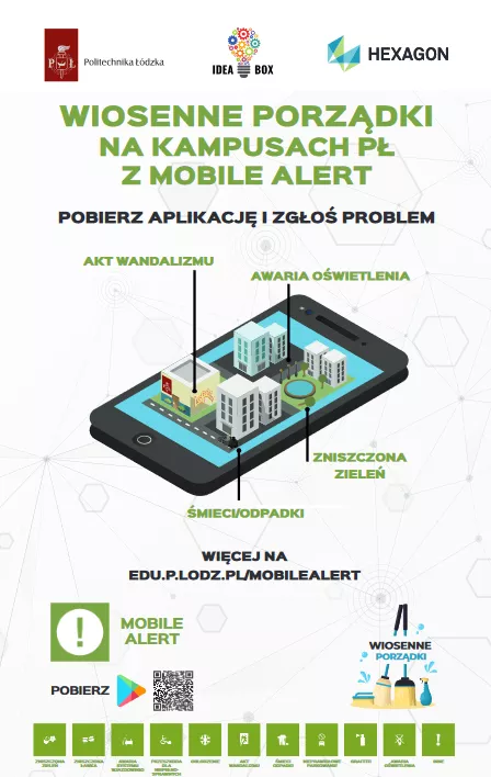 Udział w nowej inicjatywie prowadzonej pod hasłem „Wiosenne porządki na kampusach PŁ z Mobile Alert” jest otwarty dla uczelnianej społeczności i łodzian, którzy odwiedzają kampus, spacerując po parku Klepacza. Przy pomocy bezpłatnej mobilnej aplikacji „Mobile Alert” zainstalowanej na smartfonie każdy może szybko, łatwo i anonimowo zgłosić służbom kanclerskim zauważone problemy, np. uszkodzoną ławkę, zniszczoną zieleń, awarię oświetlenia, nieuprzątnięte śmieci. Służy ona informowaniu o uszkodzeniach infrastruktury uczelni, a także o nieprawidłowym parkowaniu czy przeszkodach dla osób niepełnosprawnych. Aplikacja nie jest natomiast przeznaczona do zgłaszania uszkodzeń, do których doszło wewnątrz budynków, ani sytuacji nagłych, takich jak np. pożar. Okresowe raporty umieszczane na platformie Wikamp, umożliwią sprawdzenie statusu realizacji zgłoszenia.