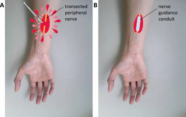 (A) Uszkodzenie nerwu obwodowego przez przerwanie jego ciągłości anatomicznej powodujące utratę funkcji i (B) wszczepienie implantu nerwowego w celu połączenia kikutów nerwów.