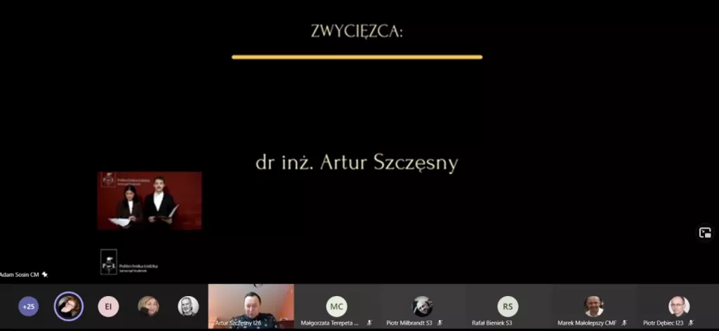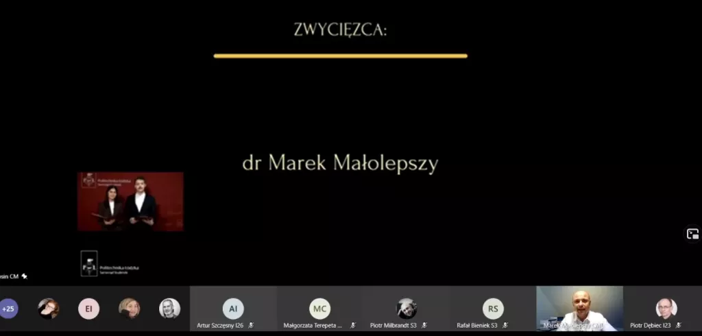 - Osobę wybraną z Wydziału Zarządzania i Inżynierii Produkcji studenci określają słowami – jest fantastycznym nauczycielem oraz opiekunem grupy, ciekawie prowadzi zajęcia. Mowa jest o dr inż. Anicie Fajczak-Kowalskiej, która dziękując powiedziała - Jest to dla mnie czwarte z kolei wyróżnienie, szczególnie ważne w tym roku, gdy zajęcia odbywają się online.