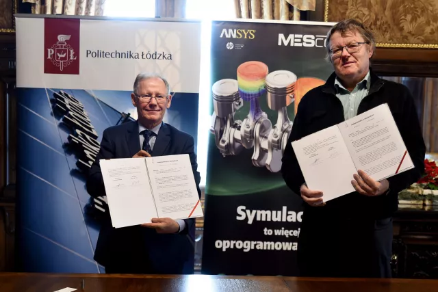 Rektor prof. Sławomir Wiak i prezes firmy MESco Mariusz Gorol podpisali porozumienie, w ramach którego Politechnika Łódzka uzyska nieodpłatnie na okres jednego roku dostęp do badawczych i dydaktycznych licencji oprogramowania ANSYS.