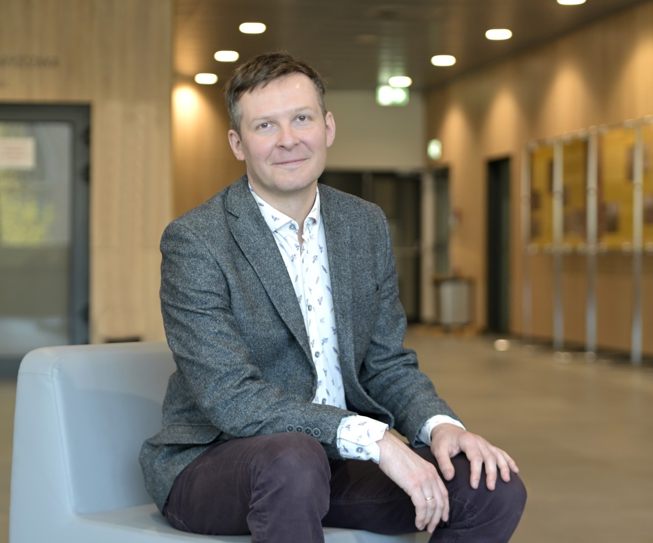 Młody mężczyzna w szarej marynarce siedzi w holu budynku, trzymając ręce na kolanach Dr inż. Igor Zubrycki