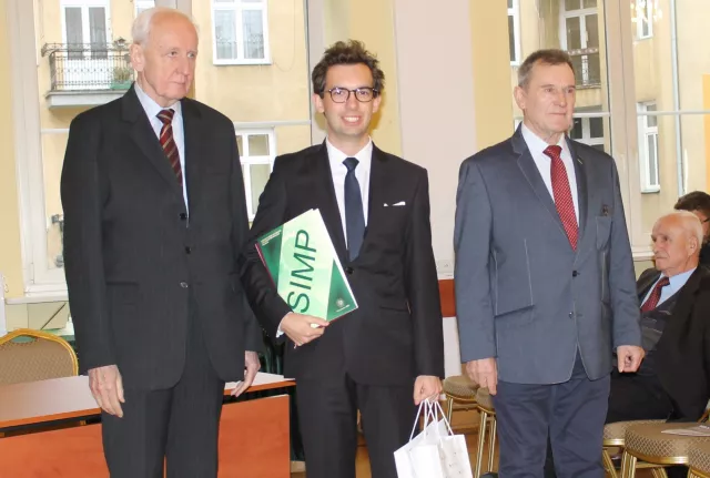 Laureat konkursu Michał Wilczek oraz przewodniczący komisji konkursowej prof. Jan Pilarczyk (od lewej) i prezes SIMP dr inż. Piotr Janicki