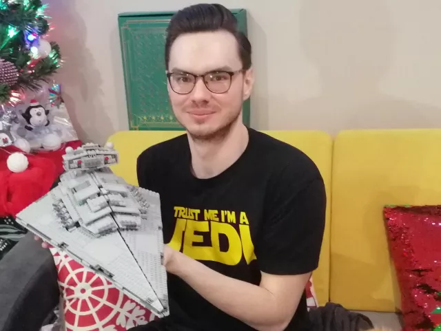 Dr Kamil Lubiński z modelem z klocków LEGO, marki nostalgicznej