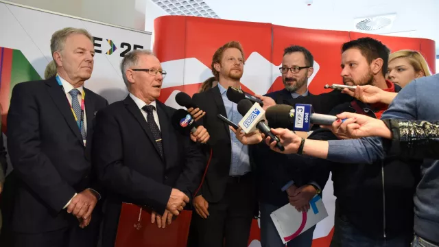 Rektor prof. Sławomir Wiak wypowiada się na konferencji prasowej, obok Alexander Krepak z Mińska (po lewej), Michael Stoetzer z Chemnitz i Krzysztof Piątkowski, wiceprezydent Łodzi