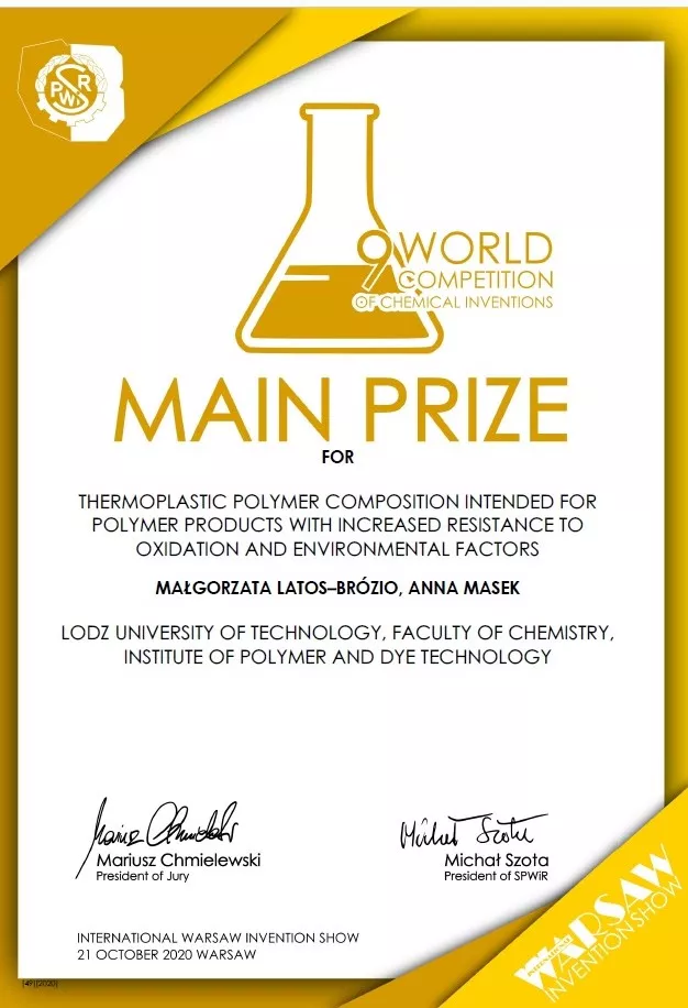 Tegorocznej Międzynarodowej Warszawskiej Wystawie Wynalazków (IWIS) towarzyszył IX Światowy Konkurs Wynalazków Chemicznych. Nagrodę główną w tym konkursie otrzymało rozwiązanie z Wydziału Chemicznego Politechniki Łódzkiej - Termoplastyczna kompozycja polimerowa przeznaczona na wyroby polimerowe o podwyższonej odporności na utlenianie i działanie czynników środowiskowych. Jego autorkami są mgr inż. Małgorzata Latos-Brózio i dr hab. inż. Anna Masek, prof. PŁ z Instytutu Technologii Polimerów i Barwników. Sukces jest podwójny, bowiem technologia ta została także doceniona przez jury wystawy IWIS, które przyznało jej złoty medal.