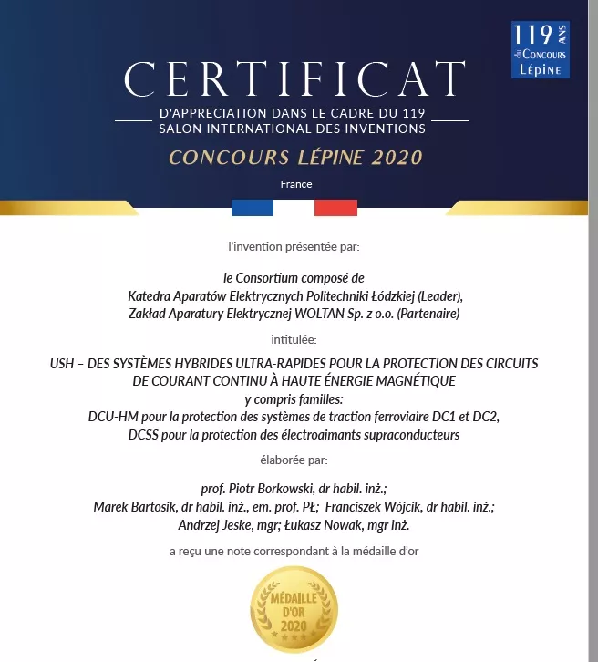 Złoty medal otrzymało rozwiązanie USH – ultraszybkie systemy hybrydowe do zabezpieczania obwodów prądu stałego o dużych energiach magnetycznych, w tym: 1a – rodzina DCU-HM dla systemów DC1 i DC2 trakcji kolejowej, 1b – rodzina DCSS dla ochrony elektromagnesów nadprzewodzących. Autorzy: prof. Piotr Borkowski, dr hab. Marek Bartosik, em. prof. PŁ, dr hab. Franciszek Wójcik, mgr Andrzej Jeske i mgr inż. Łukasz Nowak.